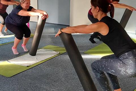 Využíváme malé i velké míče, bosu, pilates kruhy, balanční podložky, šálové gumy...