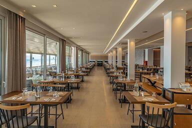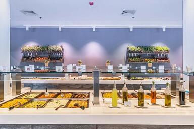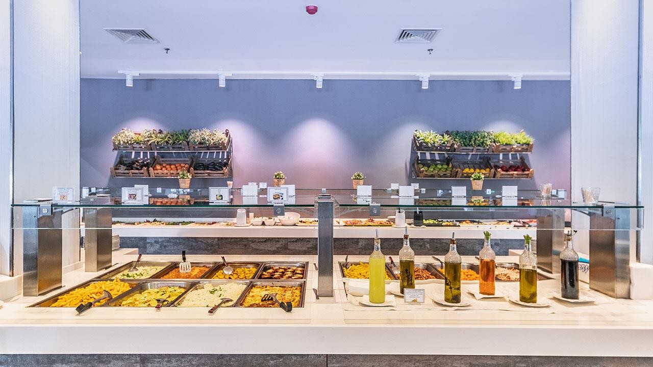 Hlavní restaurace: 7.30–10.30 snídaně formou studeného i teplého bufetu, 13.00–14.30 oběd formou bufetu, 19.30–22.00 večeře formou bufetu se širokým výběrem čerstvých salátů, hlavních jídel ovoce a dezertů. U snídaně filtrovaná káva nebo káva z automatu, čokoláda, čaj, džus, voda, během oběda a večeře bílé, růžové a červené domácí víno, stolní voda